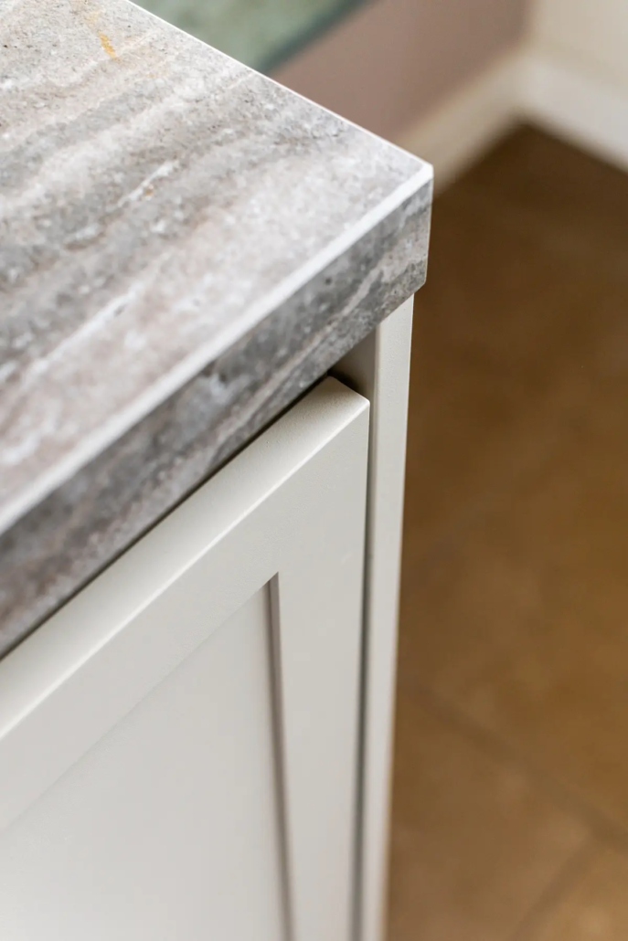 Ook in de stijl zijn duidelijke keuzes gemaakt. Ze wilden het helemaal niet strak, maar wel rustig en een beetje landelijk. Een moderne keuken met iets landelijks is het geworden. De voorkantjes van de kasten en lades geven de keuken de landelijke touch die het stel graag wilde. “Ik wilde absoluut niet helemaal strak. Rustig, landelijk. Modern met een landelijke touch.”