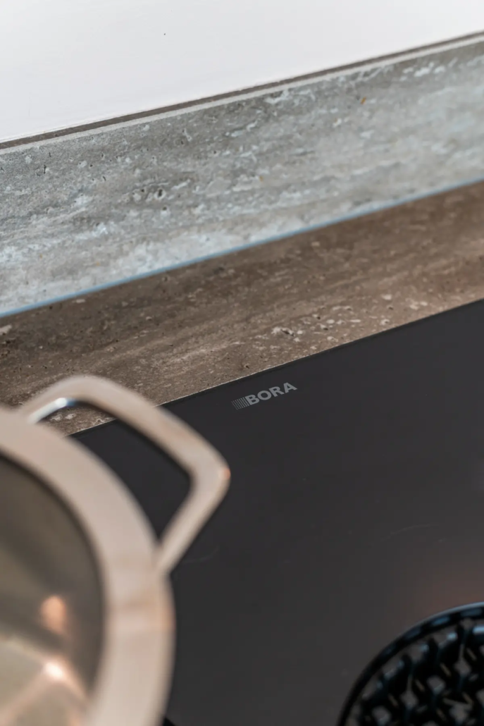 Een grote verandering is het overstappen van gas naar inductie. “We hadden eerst gas, nu hebben we een Bora-kookplaat. Dat is echt een hele vooruitgang. We zijn er heel blij mee.” De afzuiging werkt uitstekend en de hele kookzone ziet er strak uit, zonder afleiding.